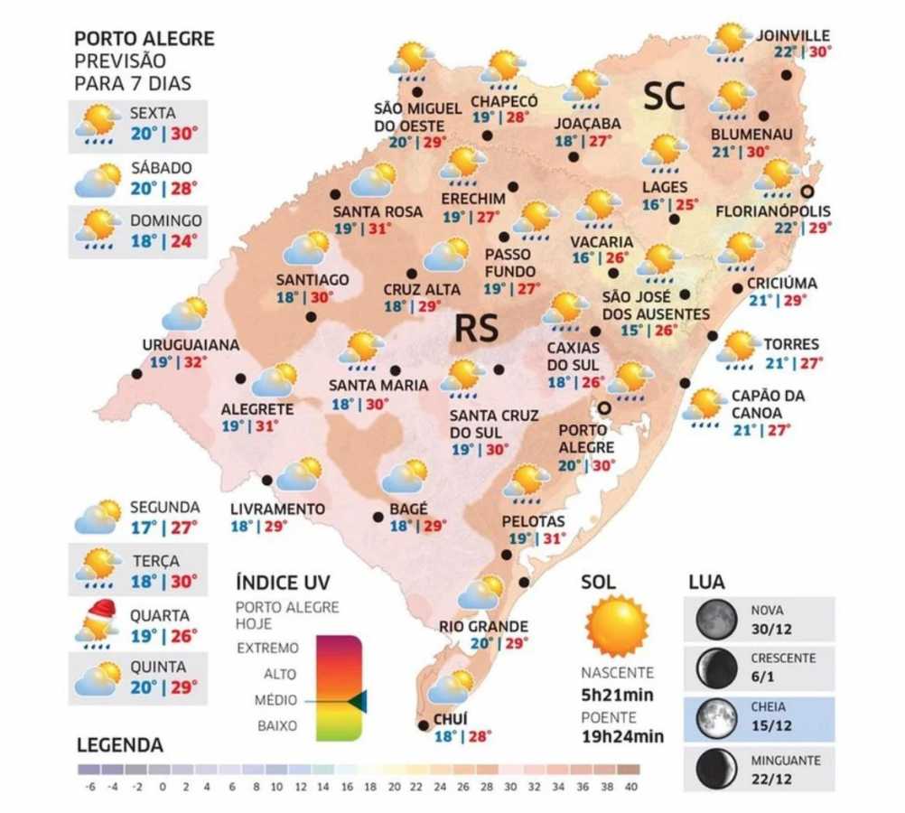 A sexta-feira (20/12) ainda começa com chuva em parte do Rio Grande do Sul, principalmente em cidades mais a Leste do estado. Entretanto, no decorrer do dia, o tempo melhora com o deslocamento de um centro de baixa pressão para o oceano.