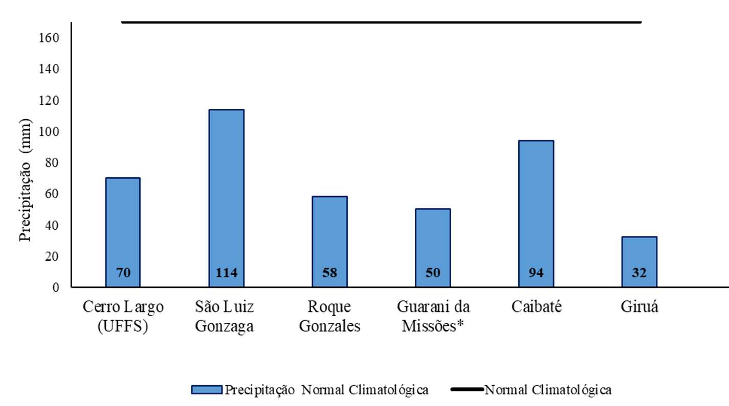 Com relação as temperaturas, notou-se que estas atingiram valores bastante altos ao longo do mês. Em vários municípios, ultrapassou-se a marca dos 35ºC. Por outro lado, a entrada de uma massa extremamente fria, atípica para o mês, provocou dias com valores de temperaturas mínimas muito baixos, o que fez cair a média das temperaturas do mês, se aproximando do esperado. O valor mínimo de temperatura registrado foi 5ºC, no centro das cidades de Guarani das Missões e Giruá.
