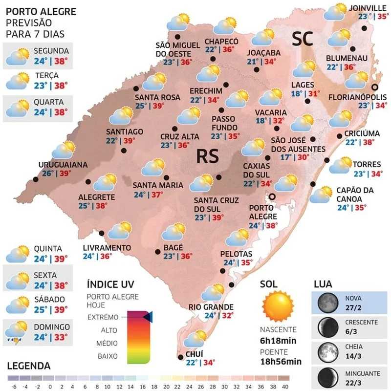 Haverá cidades na Serra com 35ºC, 36ºC à tarde. No Oeste e nos Vales, ao redor de 40ºC. O sol predomina em todo o Estado, apesar de nuvens esparsas. O calor excessivo pode trazer chuva de verão isolada no interior, especialmente da tarde para a noite. Podem ocorrer também temporais bastante localizados.