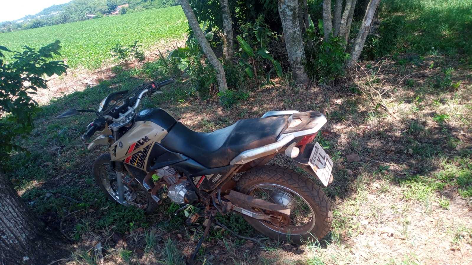 A guarnição fez acompanhamento do suspeito, que entrou em uma lavoura na Esquina Sandri Moscon, onde perdeu o controle da motocicleta, caiu ao solo e abandonou a mesma.