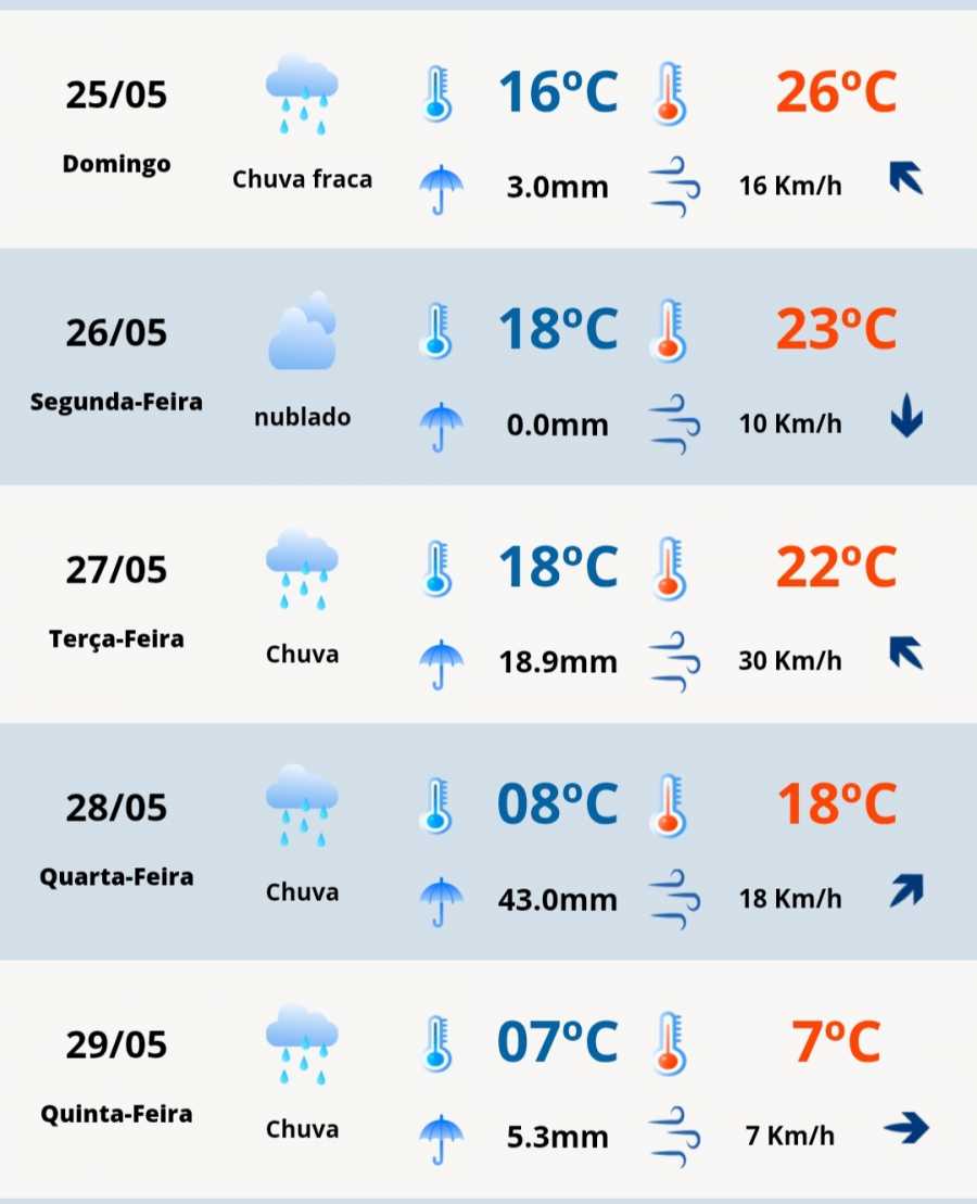 Ao longo do domingo, muitas nuvens permanecem sobre o estado e diferentes pontos devem ter períodos ainda de chuva e garoa. Isoladamente, há risco de chuva forte com trovoadas e ocasional granizo muito isolado.