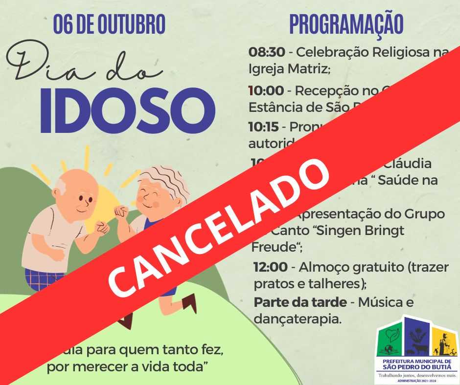 A Secretaria de Saúde e Assistência Social de São Pedro do Butiá comunica que, devido ao temporal de granizo e danos causados à comunidade butiaense, a comemoração alusiva ao Dia do Idoso, que aconteceria nesta sexta-feira, dia 06 de outubro, está cancelada.