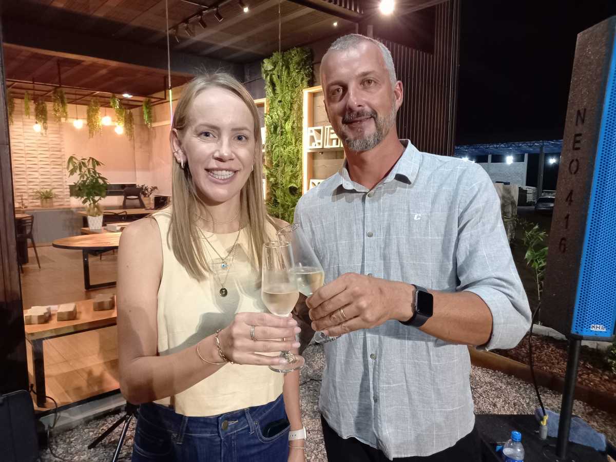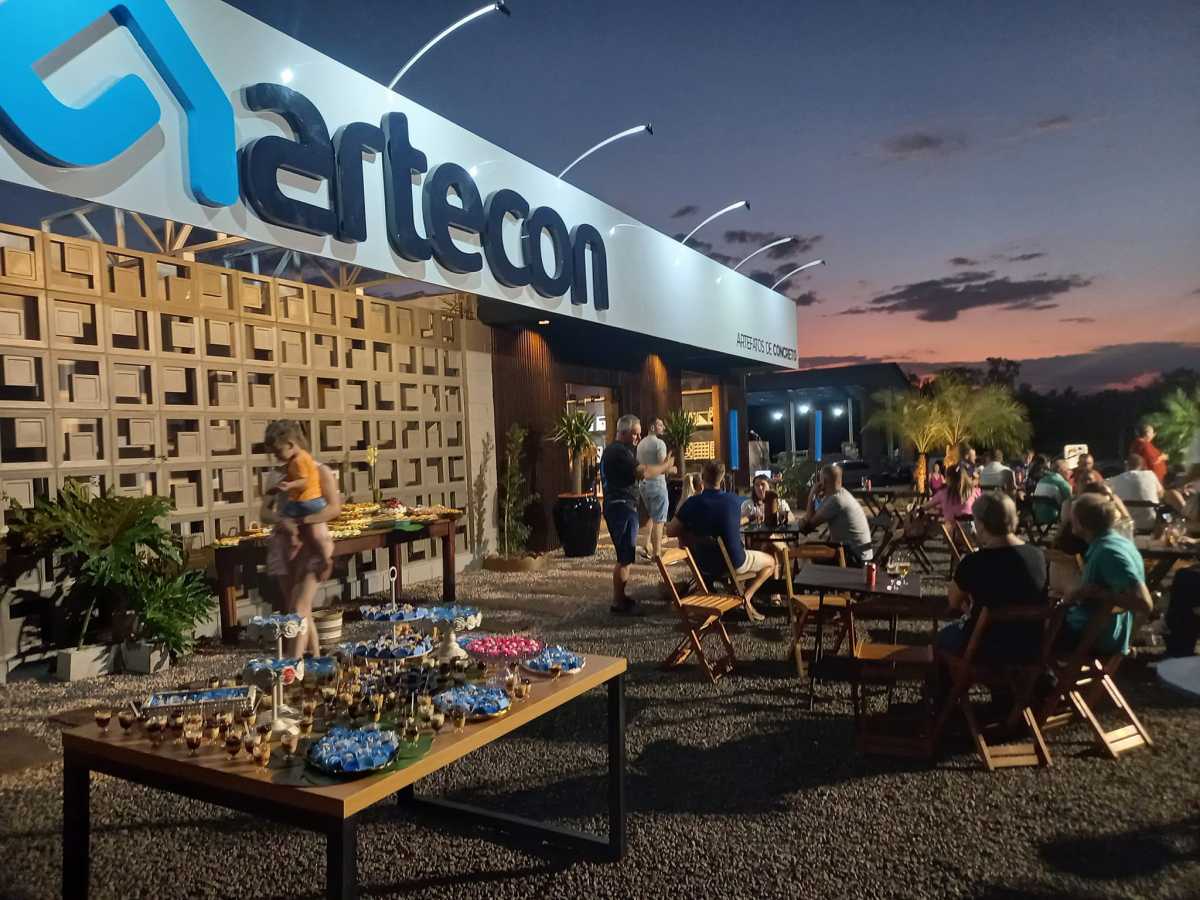 Para marcar o nono aniversário da Artecon e a inauguração solene das novas instalações, foi feito um brinde com os presentes, que depois seguiram confraternizando ao som do cantor Richael Wilmsen.