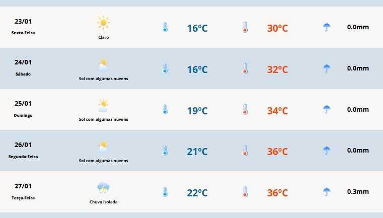Em Cerro Largo, as marcas oscilam entre 16ºC e 30ºC, enquanto em Vacaria fica entre 10ºC e 25ºC. Já em Porto Alegre e Santa Rosa terão mínima de 18ºC, enquanto as máximas serão de 30ºC e 33ºC, respectivamente.