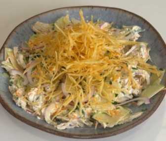 4. Misture maionese, iogurte, frango, maçã, cenoura, cebola, salsão, salsinha, azeite, limão, sal e pimenta.