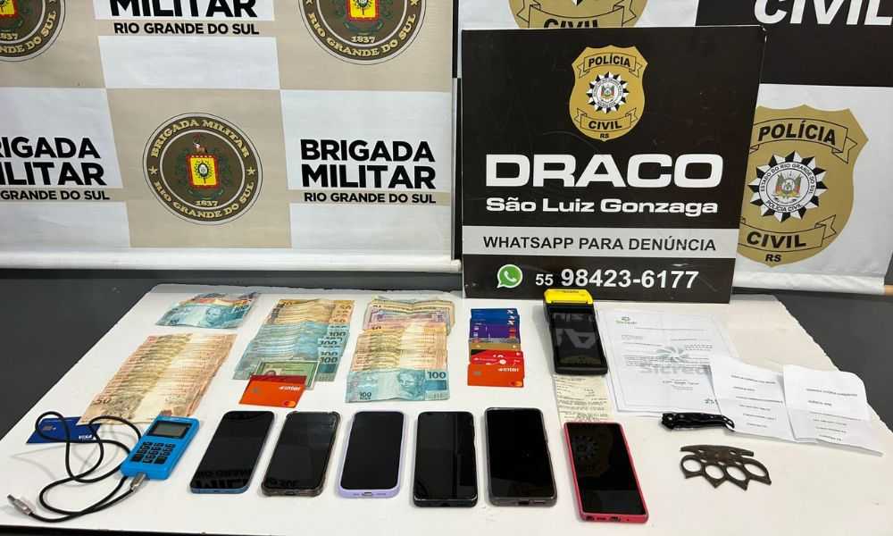Além dos cinco indivíduos presos por estelionato e associação criminosa, foram apreendidos os dois veículos, dinheiro, celulares, vários cartões de diferentes bancos e documentos relacionados a golpes aplicados.