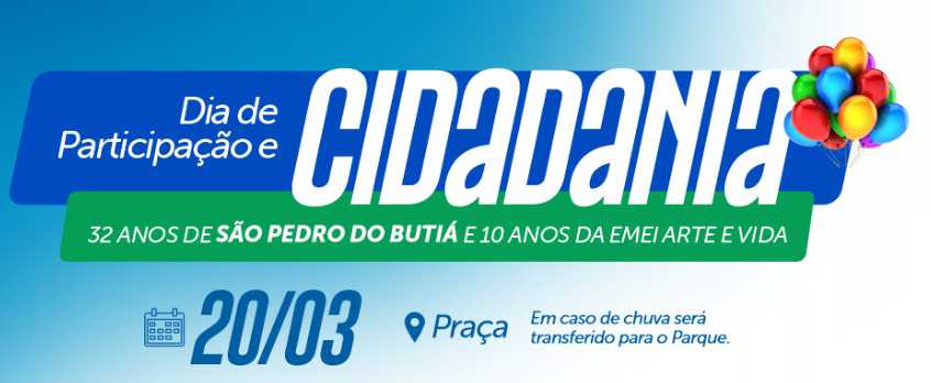 Convidamos todos os munícipes de São Pedro do Butiá e região para participar do Dia de Participação e Cidadania, Aniversário de 32 anos do Município e 10 anos da Emei Arte e Vida, no dia 20 de março, na Praça Municipal.