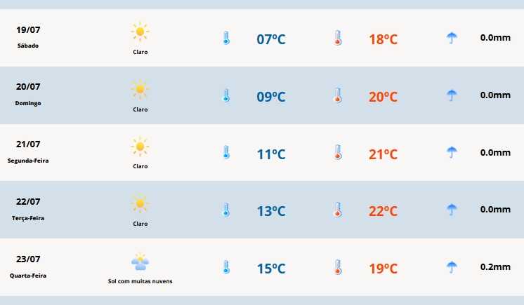 Em Cerro Largo, neste sábado a temperatura mínima será 7°C e a máxima de 18°C.