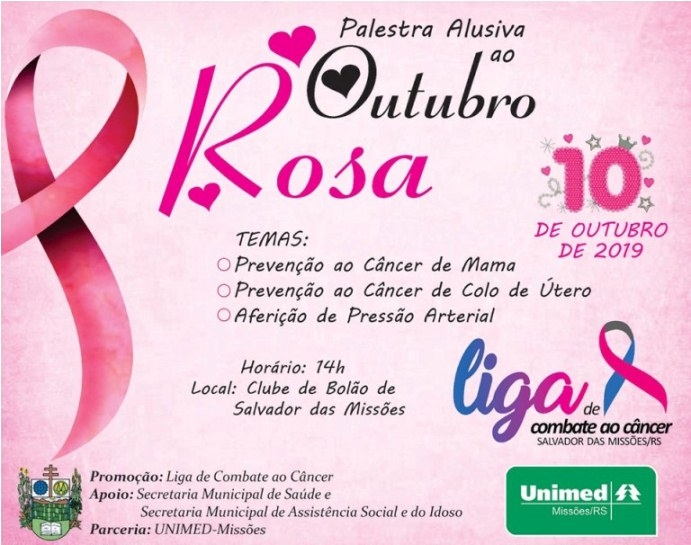 Os organizadores comunicam que a palestra do Outubro Rosa, em Salvador das Missões, será realizada no Clube do Bolão, a partir das 14h desta quinta-feira (10/10).