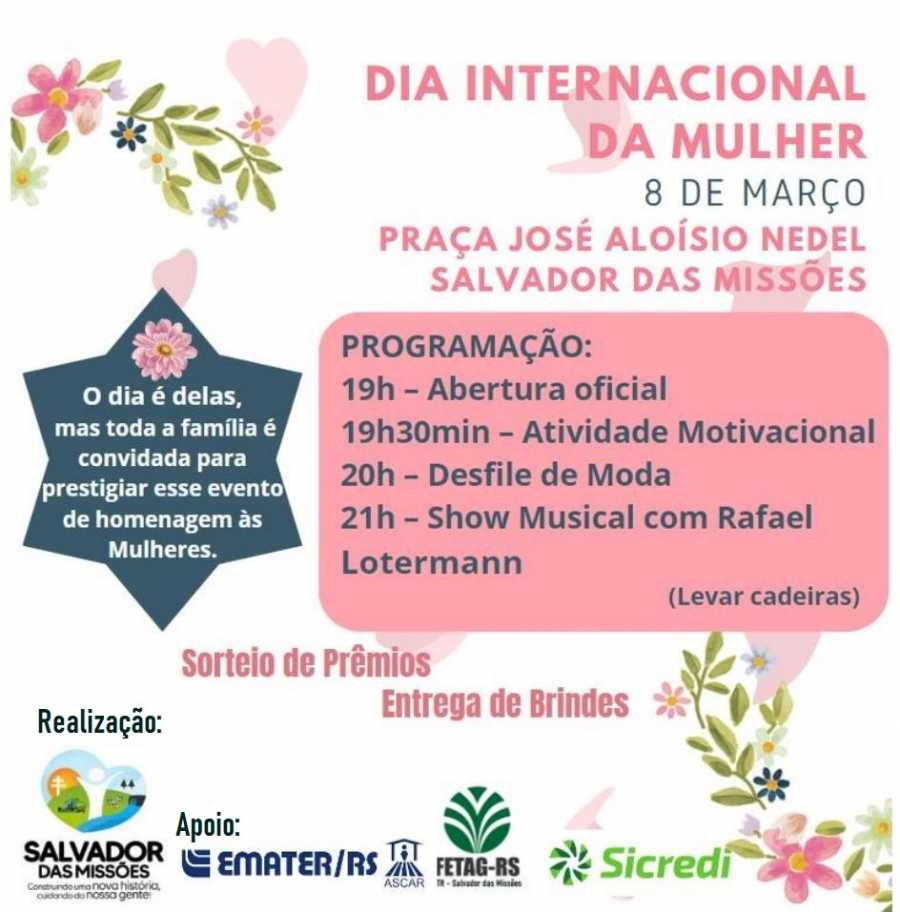 Nesta quarta-feira (08/03), haverá um evento especial na Praça José Aloísio Nedel, em Salvador das Missões, em alusão ao Dia Internacional da Mulher.