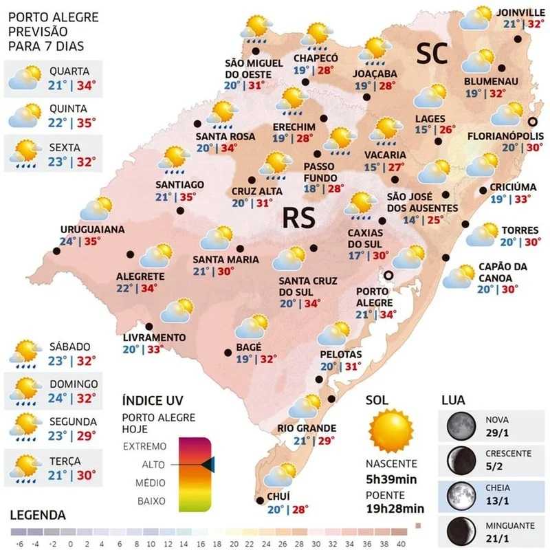 O calor persiste e aumenta no Sul e no Leste do Estado, em áreas como a de Porto Alegre.