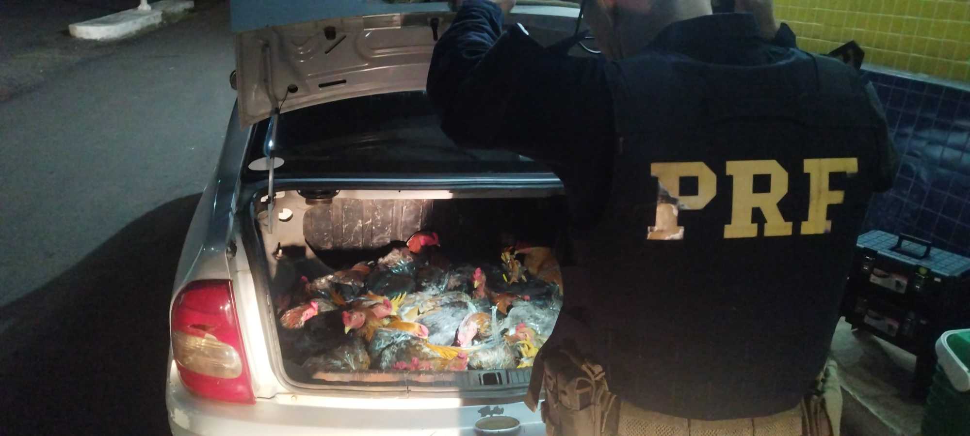 Durante fiscalização, policiais rodoviários federais abordaram um GM Corsa, emplacado na cidade. Já durante a fiscalização, os policiais visualizaram animais sob os pés do caroneiro do banco traseiro. Ao verificar o bagageiro, foram encontrados outros diversos galináceos, totalizando 26 aves da raça "mura brasileiro", conhecidos como galos de rinha.