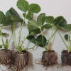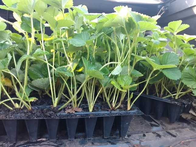 Mudas em bandejas - a produção em bandejas é a alternativa mais econômica e são utilizadas bandejas com 70 cm3 (77 células) ou 160 cm3 de substrato por célula (15 células). As mudas da linha profissional destinada a produtores de morango a nível comercial são produzidas empregando substrato comercial importado da Dinamarca, que é produzido com turfa de Sphagnum, o que, dentre outros diferenciais, garante a aeração adequada para o enraizamento uniforme, vigoroso e com alta sanidade. Para produtores caseiros ou esporádicos, produzimos e disponibilizamos as mudas enraizadas em casca de arroz carbonizada misturada ao substrato comercial.