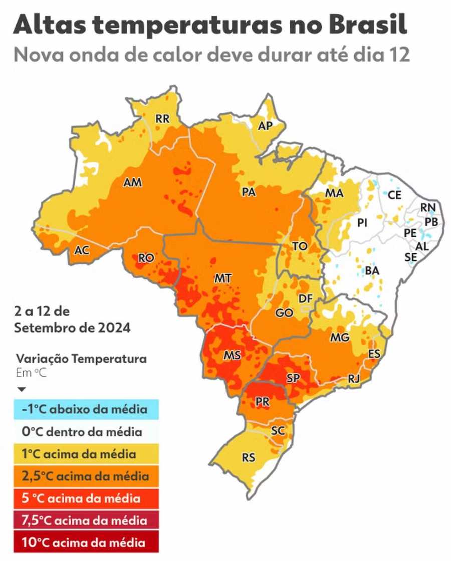 "Quanto às temperaturas, o Centro-Oeste, especialmente o Mato Grosso, deve registrar mais de 40°C. Estados como Rondônia, Tocantins, Goiás, Mato Grosso do Sul, Minas Gerais e São Paulo também devem se aproximar dos 40°C", diz Fábio Luengo, meteorologista da Climatempo.