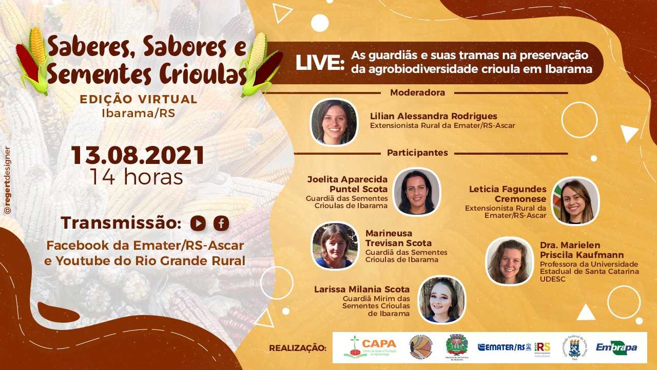 Com o tema "As guardiãs e suas tramas na preservação da agrobiodiversidade crioula em Ibarama" acontece na próxima sexta-feira (13/8), uma nova edição do Saberes, Sabores e Sementes Crioulas. Pelo segundo ano, devido à pandemia causada pelo coronavírus, o evento será realizado em formato digital, a partir das 14h, nos canais oficiais da Emater/RS-Ascar no Facebook e Youtube.
