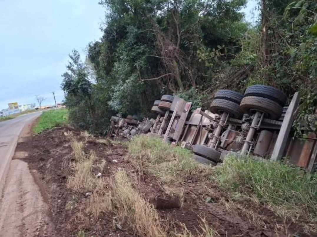 Uma carreta carregada com calcário tombou no final da tarde de quinta-feira (17/07) na lateral da RS 342, em Ijuí, nas proximidades do Posto 44, no sentido Cruz Alta/Ijuí.