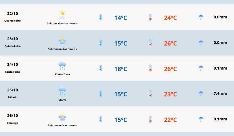 O amanhecer ainda será frio para a época do ano, com mínimas entre 8°C e 12°C na maioria das regiões e até 5°C em pontos da Serra. No decorrer da manhã, as temperaturas sobem rapidamente, e a tarde será agradável a quente, com máximas que podem chegar a 30°C em áreas do Noroeste e dos Vales.