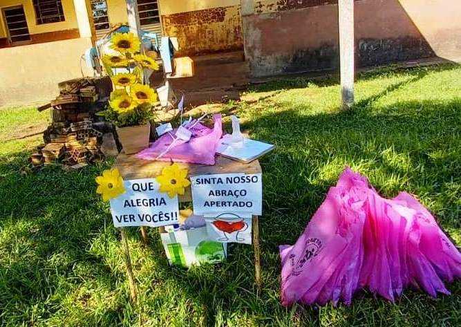 Ainda na sacola, uma toalha de lavabo a ser decorada com as noções de artesanato de cada um. O envio da toalha tem um significado especial, uma espécie de lembrete para que não esqueçam de lavar frequentemente as mãos, principalmente neste momento de pandemia.