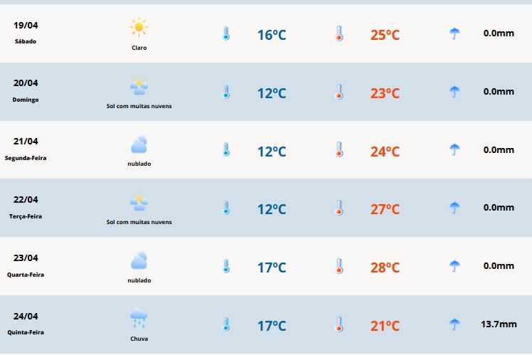 Em Cerro Largo a temperatura terá mínima de 16ºC e máxima de 25ºC.