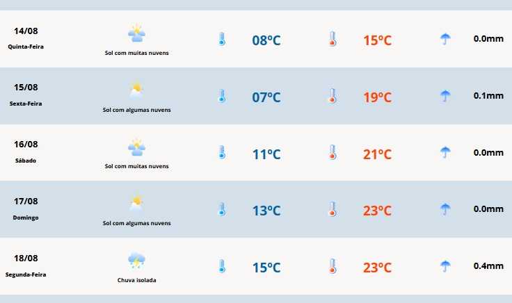 Em Cerro Largo a temperatura mínima será de 8°C e a máxima de 15°C.