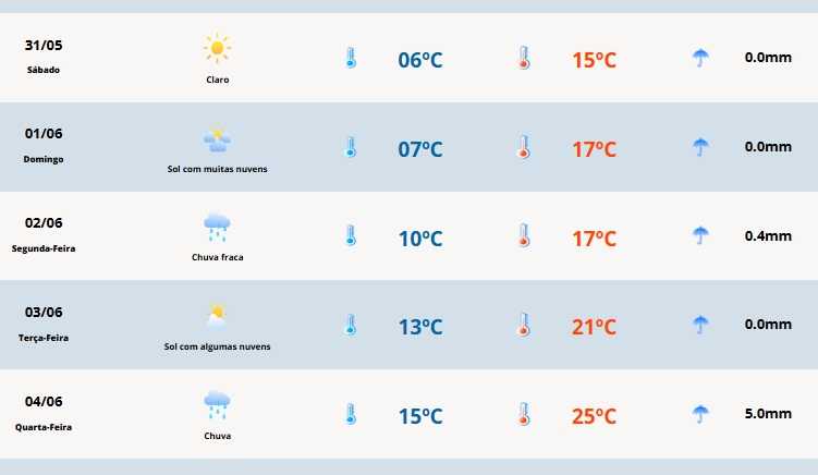 Em Cerro Largo, a temperatura mínima será de 6°C e a máxima de 15°C.