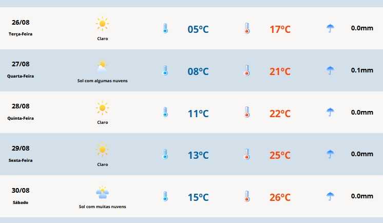 A temperatura mínima em Cerro Largo será de 5°C, enquanto a máxima será de 17°C.