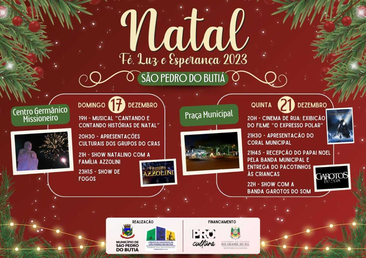 Em clima natalino de reviver a fé e a esperança, a Administração Municipal de São Pedro do Butiá, juntamente com o Conselho Municipal de Turismo e com apoio da ACI, com muita alegria, convidam os munícipes e região para prestigiarem o Natal Fé, Luz e Esperança, que terá a seguinte programação: