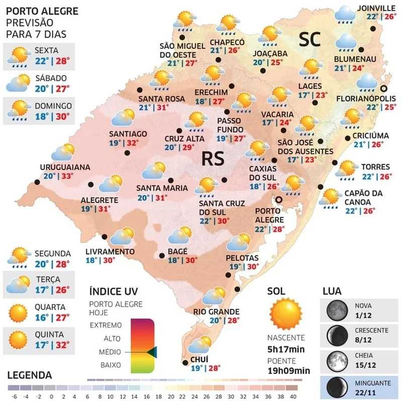 O ar tropical quente e úmido permanece no Rio Grande do Sul nesta sexta-feira (29/11).