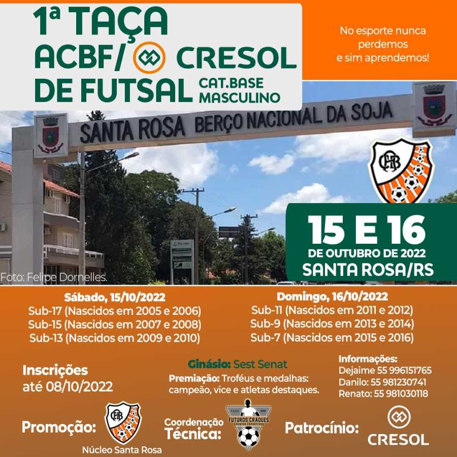 Em parceria com a empresa Futuros Craques Eventos Esportivos, o núcleo da ACBF de Santa Rosa, coordenada pelo goleiro Danilo, definiu da melhor forma possível a comemoração de um ano de trabalhos, por meio da realização de um torneio de futsal de categorias de base (masculino).
