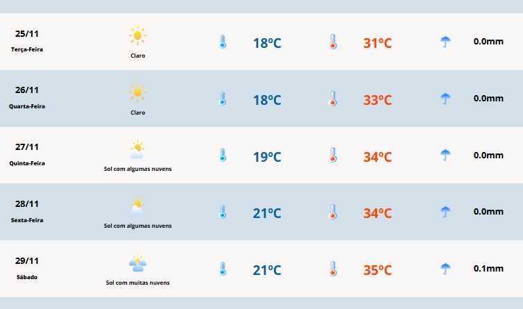 O período da tarde será de calor, com máximas que podem chegar aos 30°C em algumas regiões. Haverá vento moderado.
