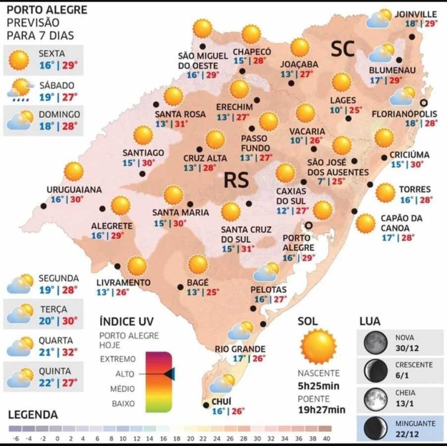O sol predomina nesta sexta-feira (27/12) no Rio Grande do Sul sob influência de uma massa de ar seco de alta pressão atmosférica. O dia terá amplos períodos de céu claro na maioria das regiões. No Sul do Estado, a circulação de um ciclone no Atlântico ainda trará nuvens.