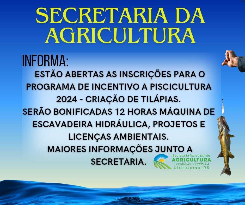Estão abertas as inscrições para o Programa de Incentivo à Piscicultura 2024, para criação de tilápia, no município de Ubiretama.