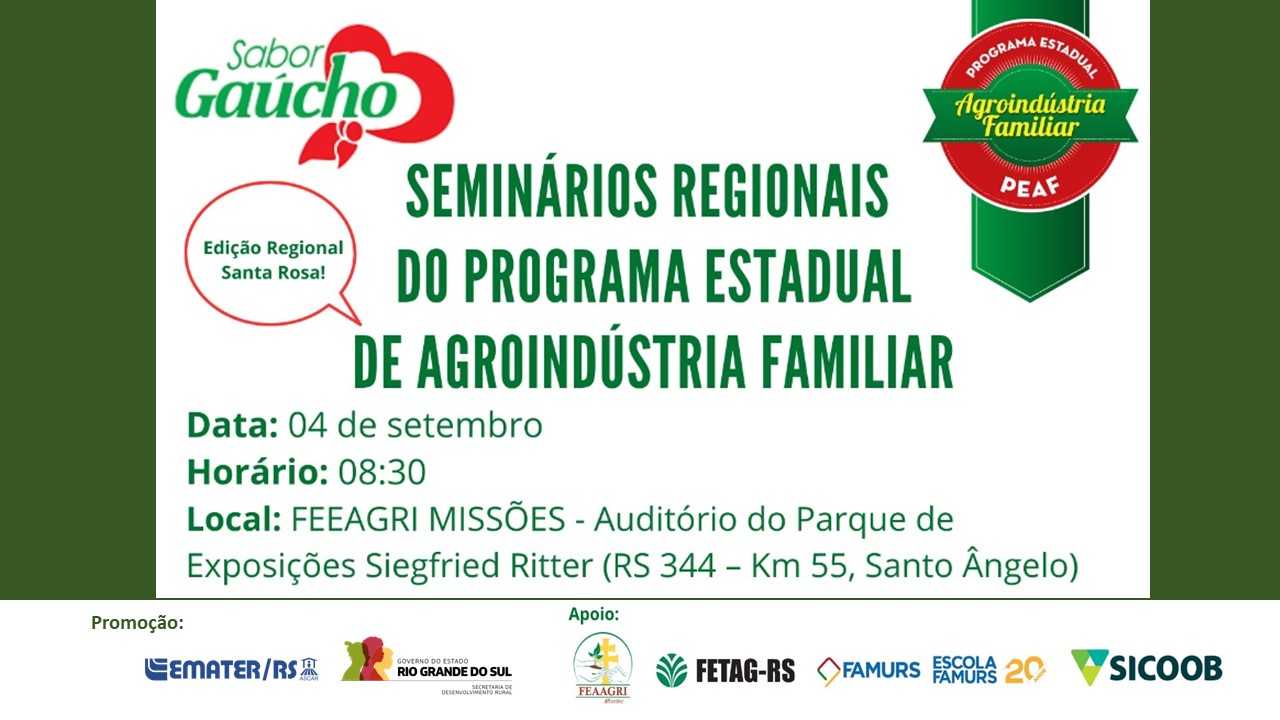 O Seminário Regional de Agroindústria Familiar acontece nesta quarta-feira (04/09). O evento é uma promoção da Emater/RS-Ascar e da Secretaria Estadual de Desenvolvimento Rural (SDR). Conta com o apoio da Feaagri Missões, Fetag, Famurs e Sicoob.