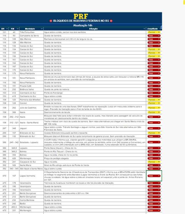A Polícia Rodoviária Federal (PRF) emitiu um boletim atualizado com a lista de rodovias federais com bloqueios no RS;