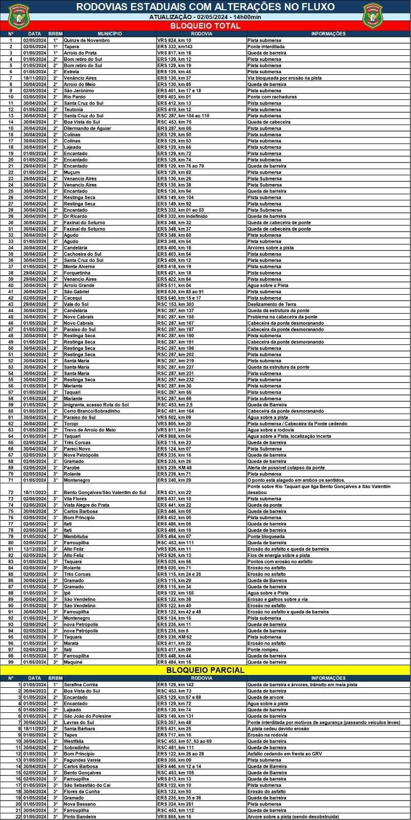 Além disso, são 101 os pontos com bloqueios totais nas rodovias estaduais do RS. Outros 22 trechos estão com tráfego parcialmente restrito, segundo boletim do Comando Rodoviário da Brigada Militar (CRBM), divulgado às 12h40min desta quinta-feira (2).