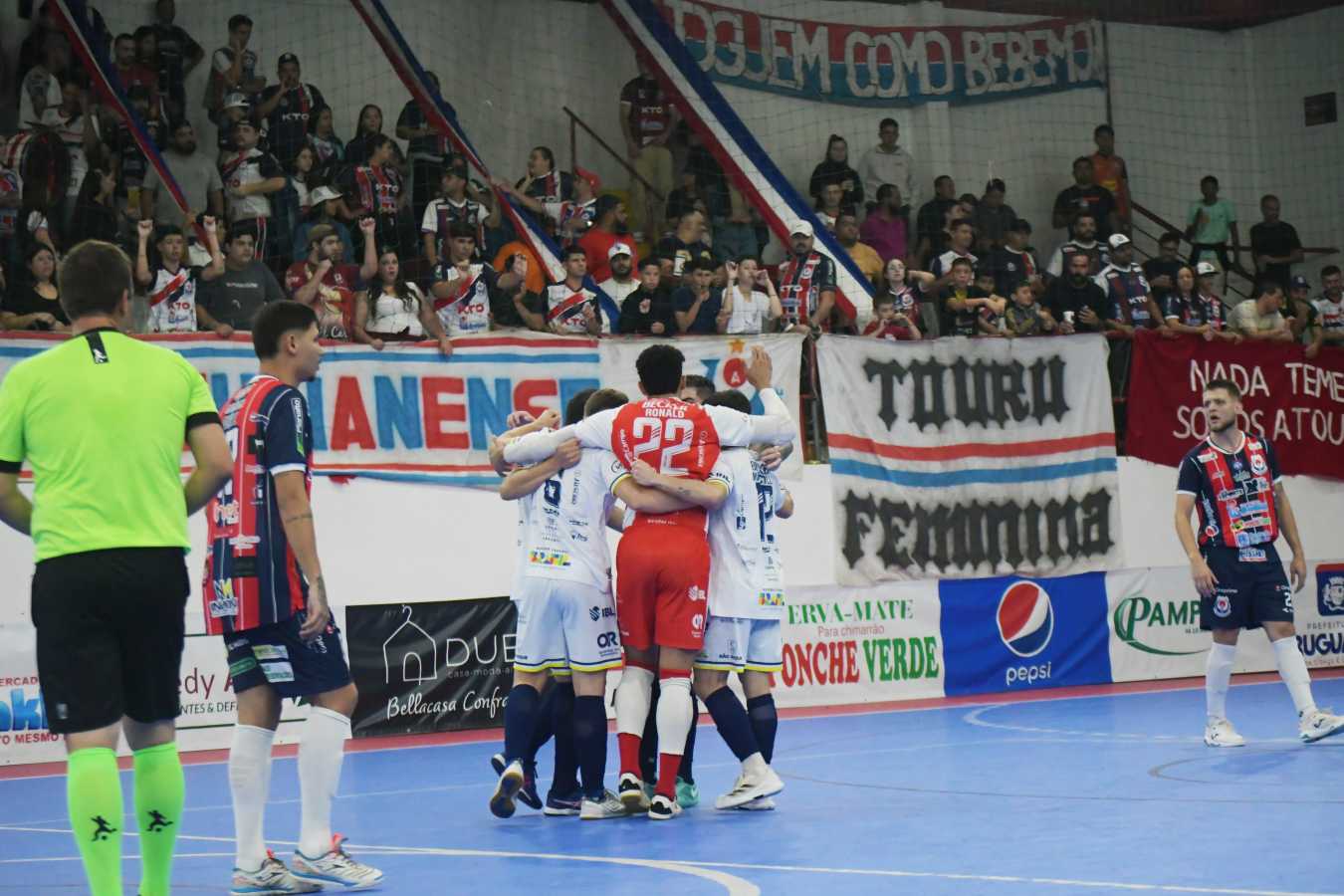 Sem contar com o ala Nenê e o pivô Rafinha, o Cerro Largo Futsal iniciou em Uruguaiana com Black no gol, mais Rato, Cavinato, Douglas e Isaac. Com pouco mais de um minuto, o goleiro Deivid começou a impor sua característica de jogar pra frente, trabalhando bastante adiantado em quadra. A primeira grande chance dos visitantes veio em cobrança de bola parada. De média distância, Thauan chutou direto e Deivid fez boa defesa com o pé.