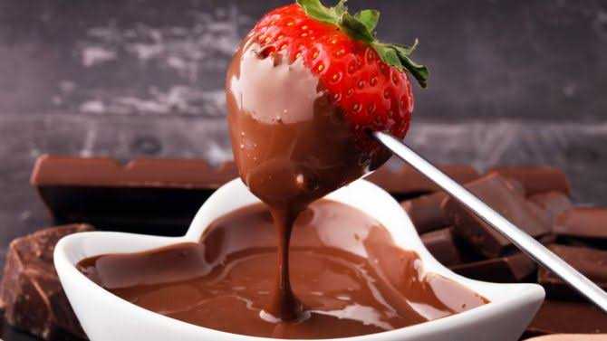 Receita de Fondue de Chocolate Cremoso, feito com creme de leite, chocolate, conhaque e servido quente com frutas frescas, é uma ótima dica para comemorar o Dia dos Namorados a dois.