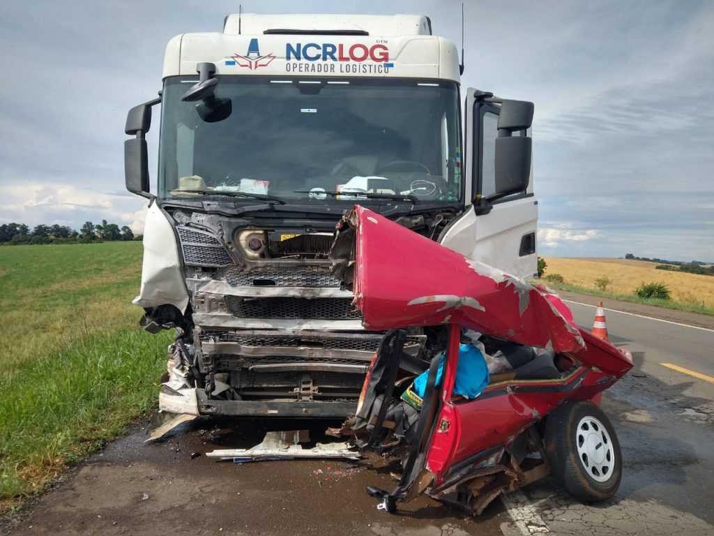 O fato ocorreu no Km 317 da rodovia, envolvendo um VW/Passat, de cor vermelha e uma Carreta Scania G410, carregada de peças. Ambos com placas de Passo Fundo.