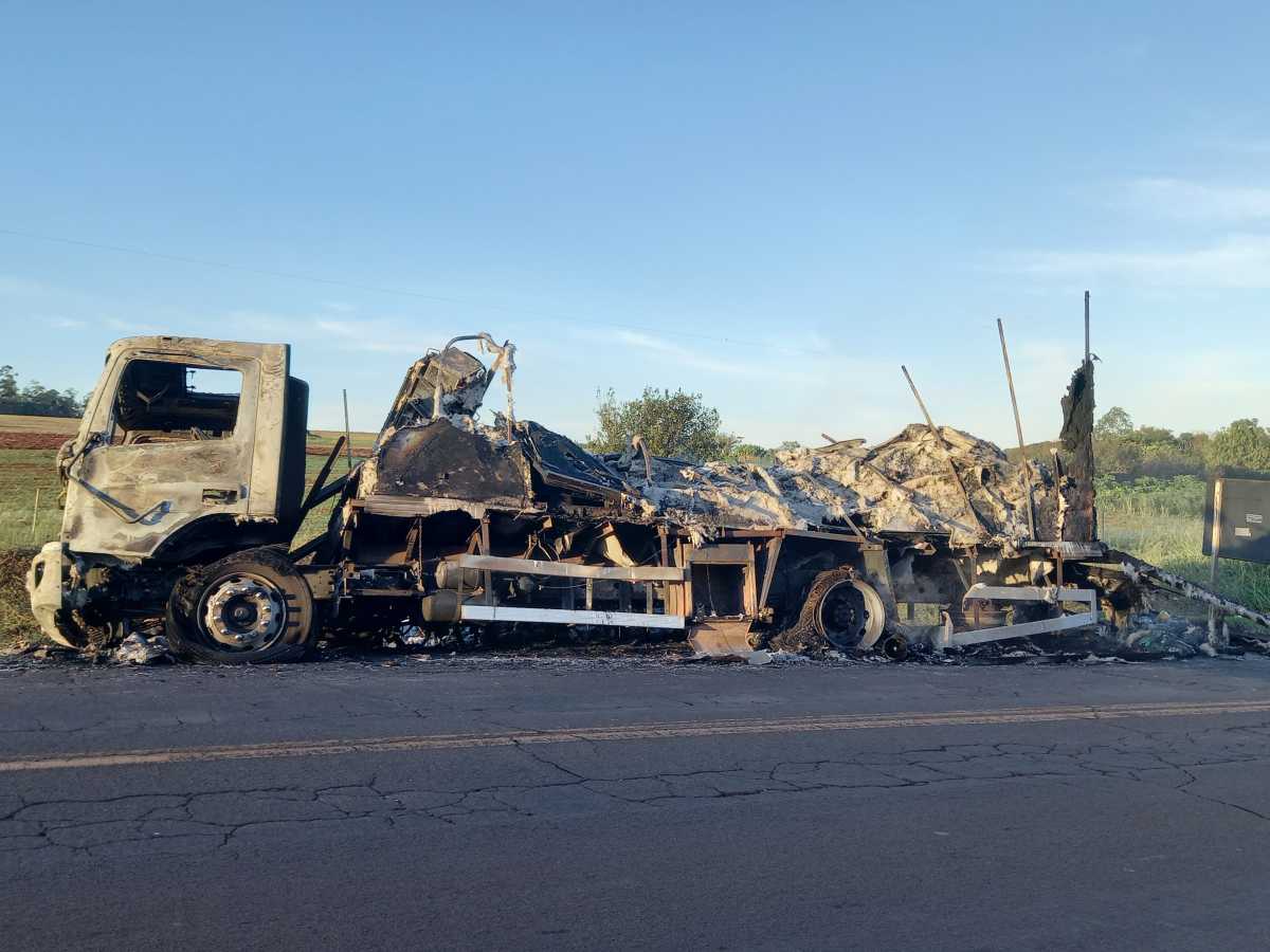 Um caminhão, consumido pelo fogo, está estacionado no acostamento da rodovia, poucos metros antes do trevo de acesso à Vila Dona Otília / São Paulo das Missões.