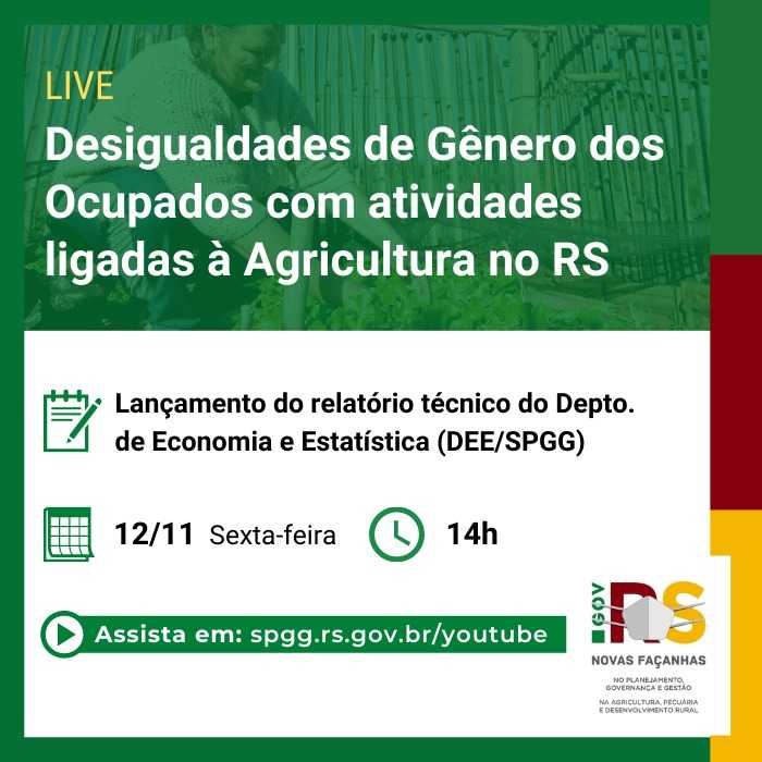 O lançamento ocorre após a apresentação do relatório técnico sobre Desigualdades de Gênero dos Ocupados com Atividades Ligadas à Agricultura do RS, elaborado pelo Departamento de Economia e Estatística da Secretaria Estadual de Planejamento, Governança e Gestão (DEE/SPGG), que pode ser acompanhada neste LINK.
