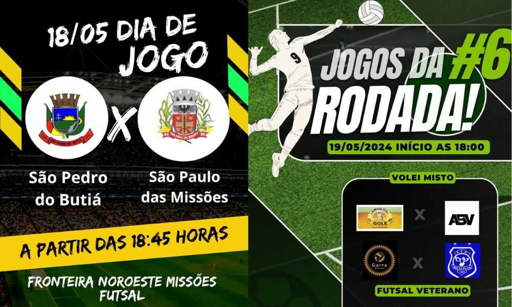 E no domingo (19/05), será realizada a sexta rodada do Campeonato Municipal de Futsal e Vôlei, com início às 18h, também no Ginásio Municipal Otto Avelino Kuhn, que contará com a seguinte ordem de jogos: