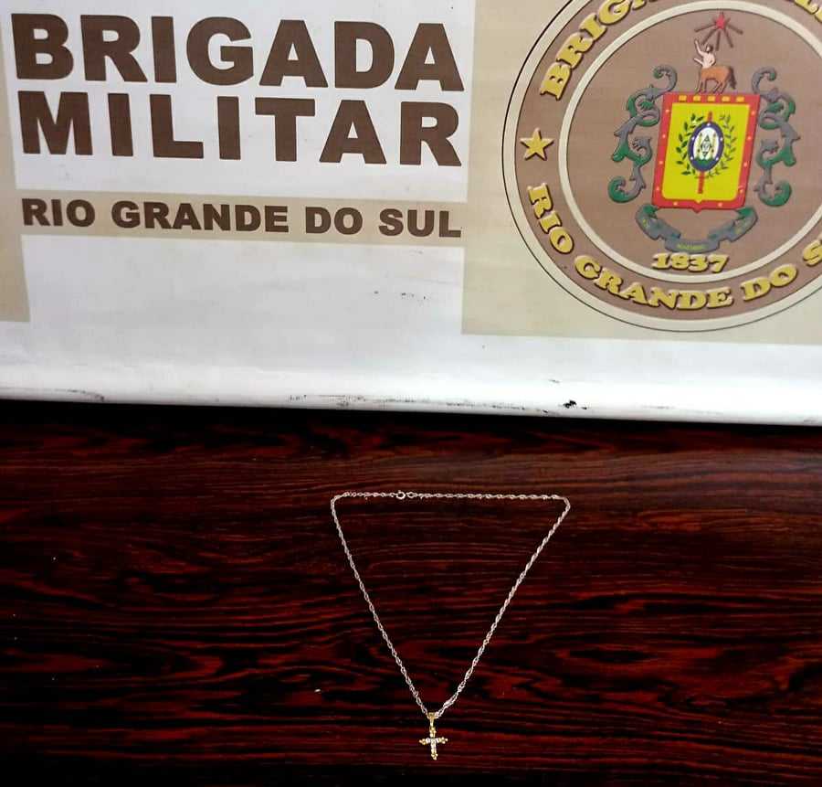 Em revista pessoal, foi localizada no bolso de sua bermuda uma corrente de prata, com crucifixo folheado a ouro, objeto este oriundo de furto em residência ocorrido na terça-feira (25/1).