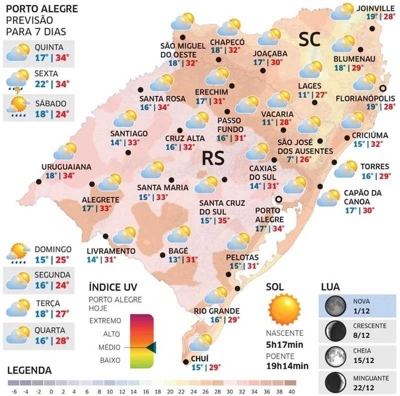 Depois de dois dias agradáveis na maior parte do Rio Grande do Sul, a temperatura dispara na quinta-feira (05/12) com o ingresso de ar mais quente no território gaúcho.