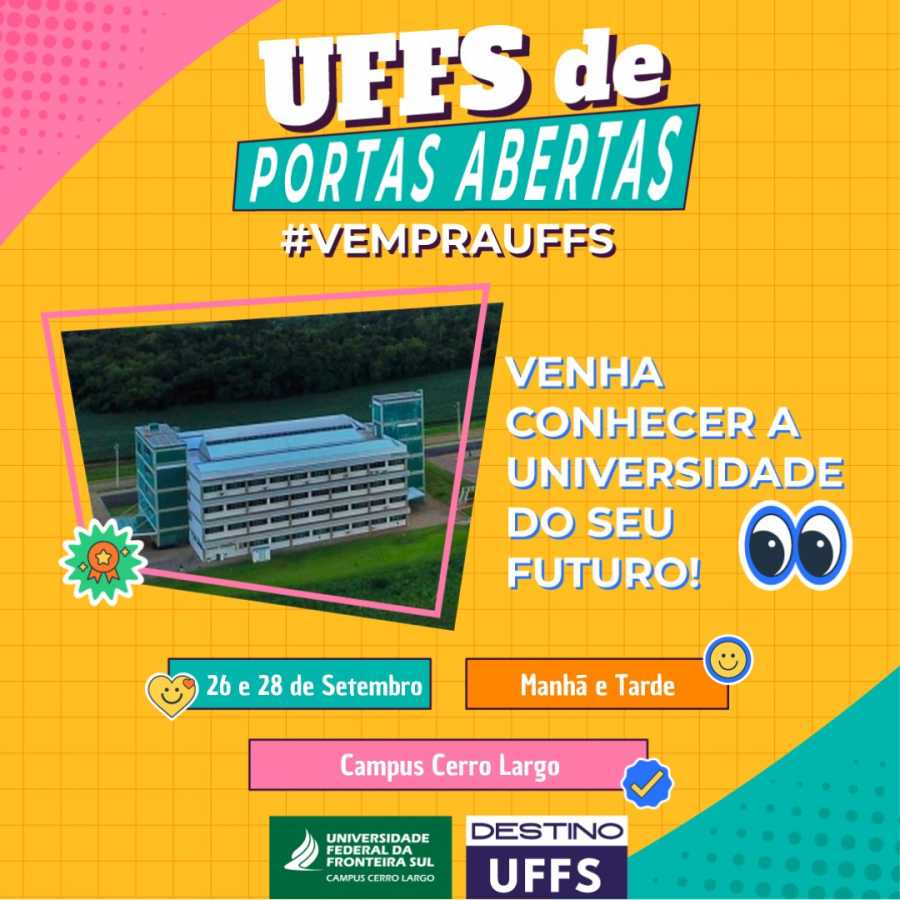 A UFFS-Cerro Largo convida as escolas da região para participarem do evento Vem pra UFFS, que ocorrerá nos dias 26 e 28 de setembro, durante todo o dia. Este evento oferecerá uma oportunidade única para os visitantes conhecerem a universidade, seus cursos, estrutura e dialogarem com alunos e docentes.