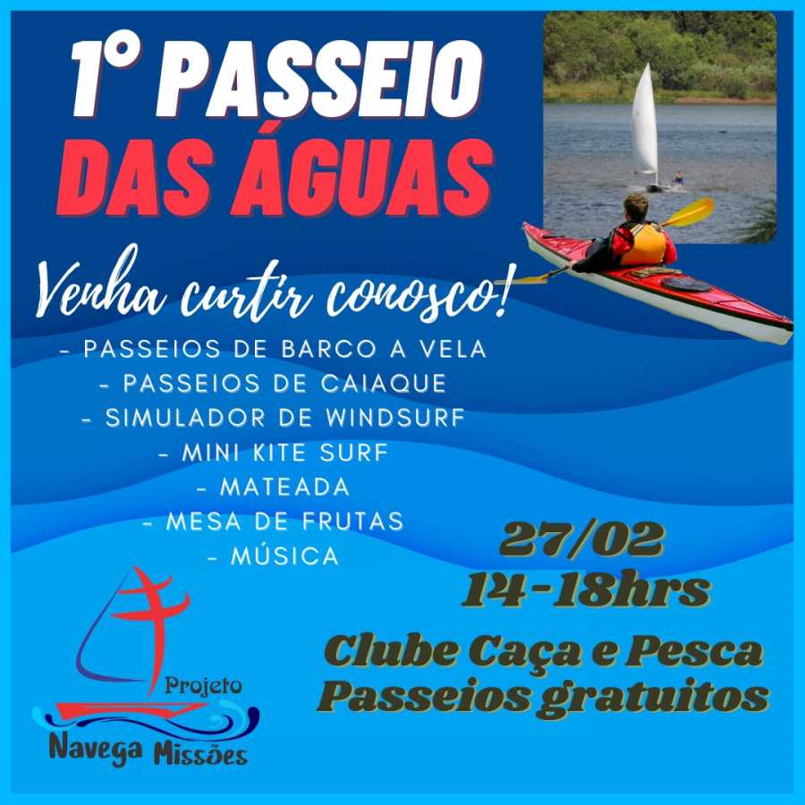 Trata-se do 1º Passeio das Águas, que marcará o início da Escola de Vela Navega Missões, oferecendo a oportunidade para as pessoas conhecerem este esporte olímpico e estar em contato direto com a natureza.