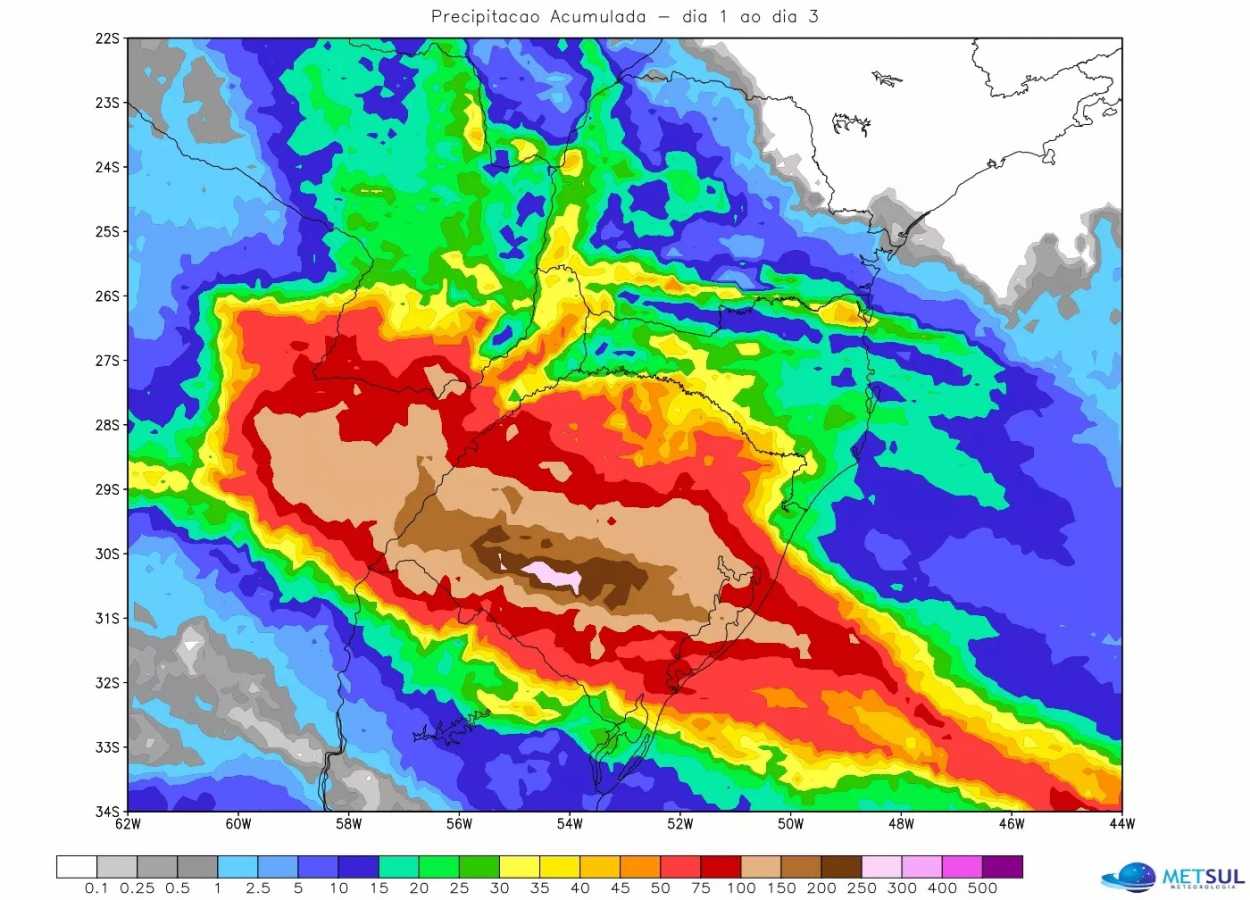 Vários pontos, em especial do Oeste, Centro e o Sul gaúcho, podem ter 50 mm a 150 mm em poucas horas com risco de marcas até superiores em menos de seis horas, trazendo alagamentos e inundações repentinas.