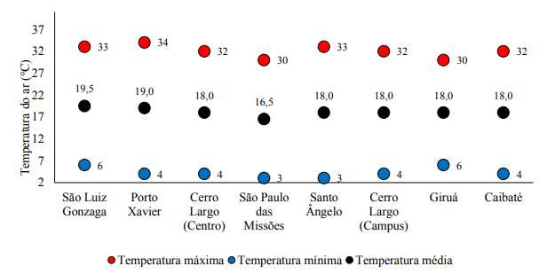 Em Giruá, o acumulado de chuva foi 96% maior que a Normal Climatológica e praticamente o dobro registrado em São Luiz Gonzaga. As estações meteorológicas da UFFS registraram valores relativamente elevados de temperatura do ar neste mês de maio de 2021, chegando à marca dos 34°C, como ocorreu em Porto Xavier. Esta é uma característica do clima local, agravada pela condição de La Niña, que, por proporcionar períodos secos mais frequentes, pode conduzir a períodos com maiores temperaturas do ar. Os valores mínimos registrados foram relativamente expressivos, sendo 3°C a temperatura mínima do ar registrada em São Paulo das Missões e Santo Ângelo. Estas condições proporcionaram um bom estabelecimento e crescimento inicial para as pastagens anuais de inverno na região.