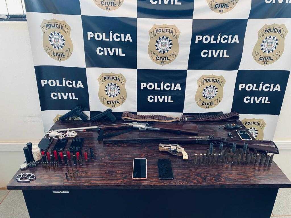 Durante as diligências, foram encontradas espingardadas, munição e um revólver com numeração raspada. Um homem preso, 28 anos de idade, era o responsável pela guarda das armas utilizadas na ações criminosas.