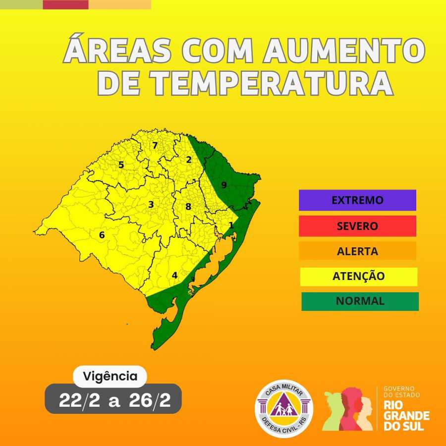 A Defesa Civil do Rio Grande do Sul e a Sala de Situação orientam que, entre os dias 22 e 26 de fevereiro, há previsão de uma massa de ar quente e seco sobre boa parte do Rio Grande do Sul.