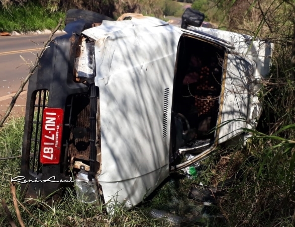 Mas somente leves arranhões em uma das pernas do condutor foi o resultado de um capotamento ocorrido pouco antes do meio-dia de hoje (11), na ERS 168, cerca de dois quilômetros do trevo de acesso à Roque Gonzales.